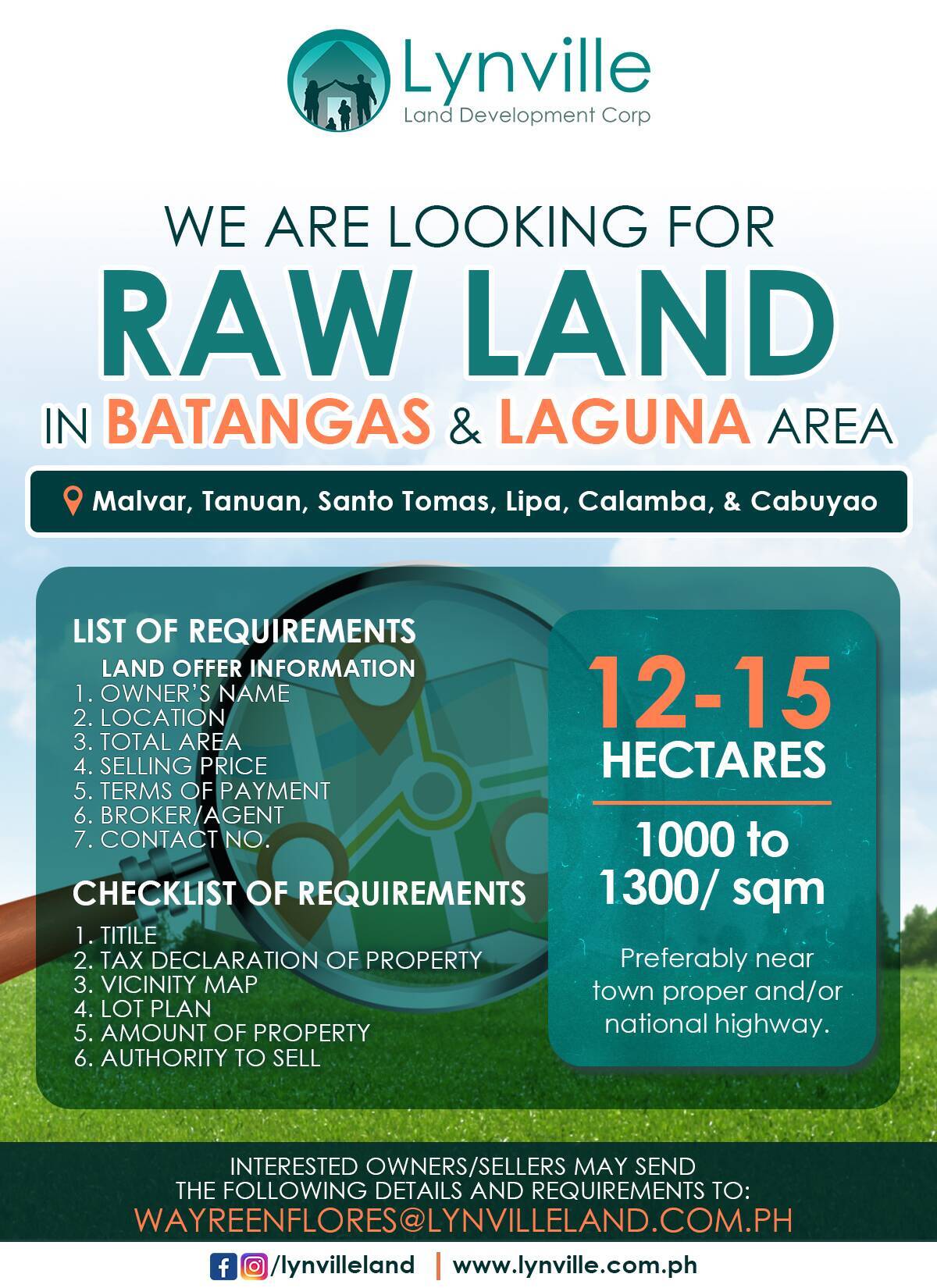 Interested owners/sellers may send the following requirements on: wayreenflores@lynvilleland.com.ph